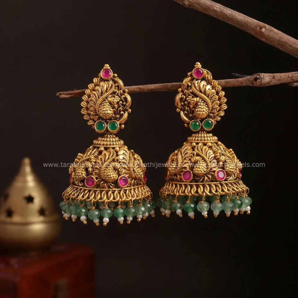 This beautiful Jumka made of copper and brass with kemp stones and has a gold look alike finish to it.