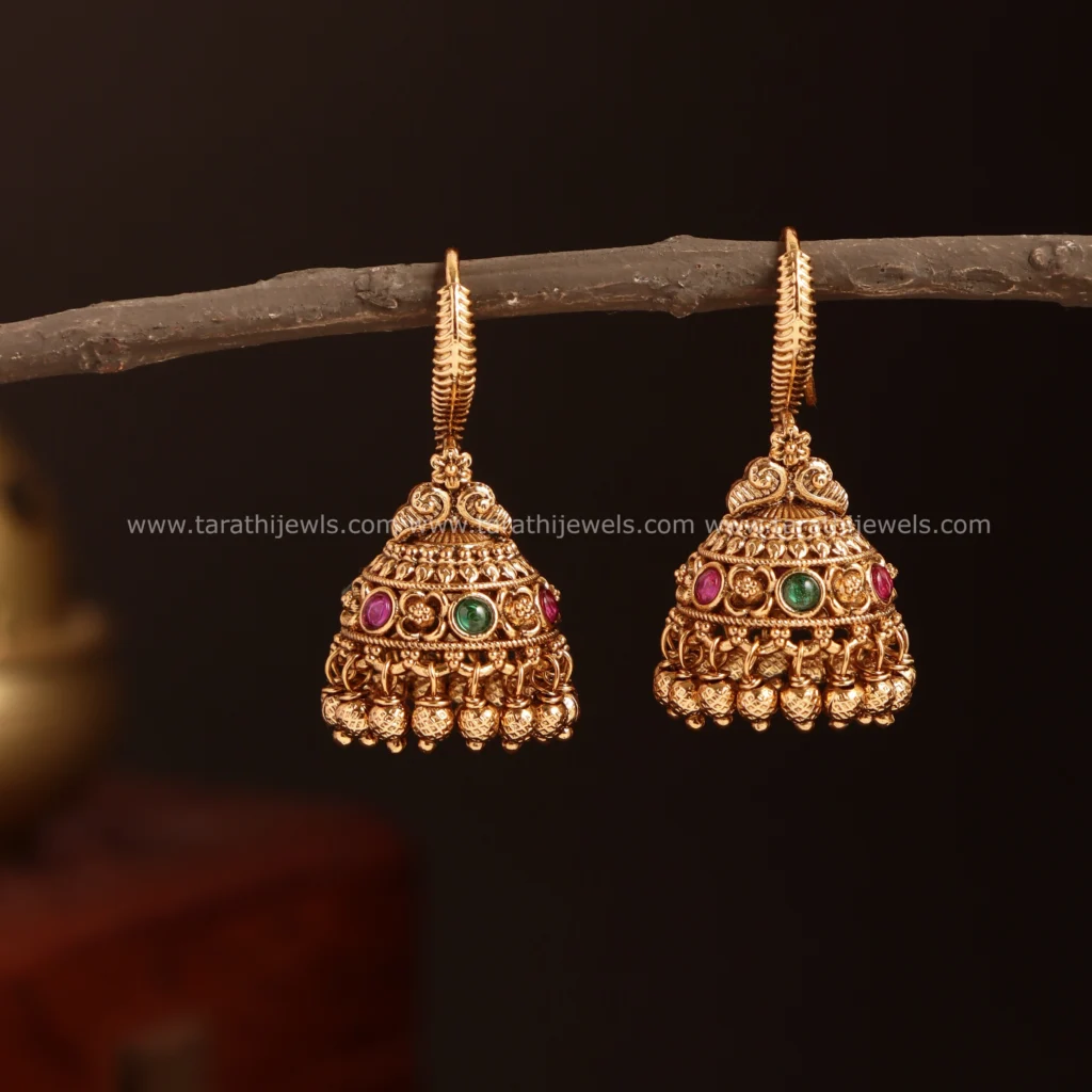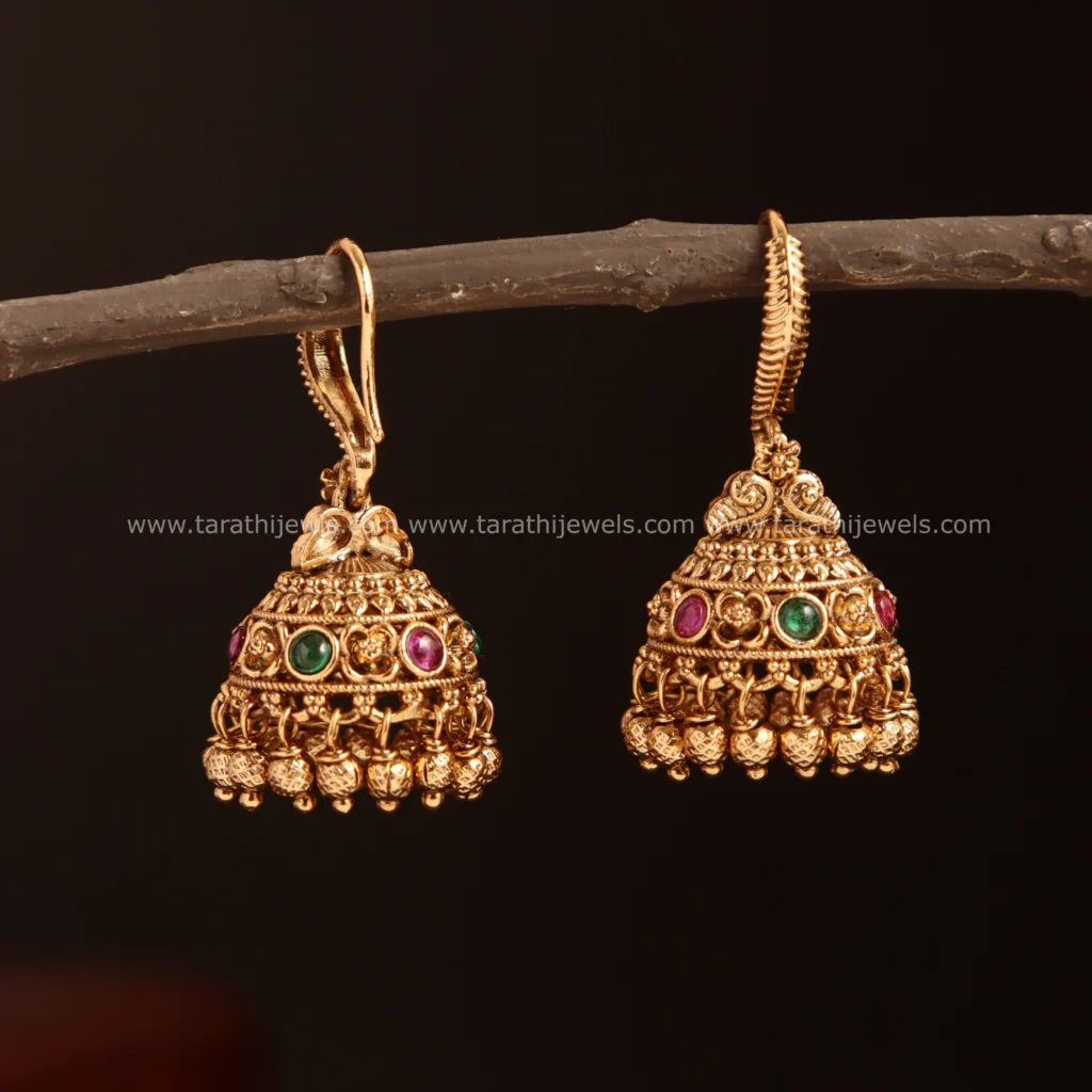 This beautiful Jumka made of copper and brass with kemp stones and has a gold look alike finish to it.