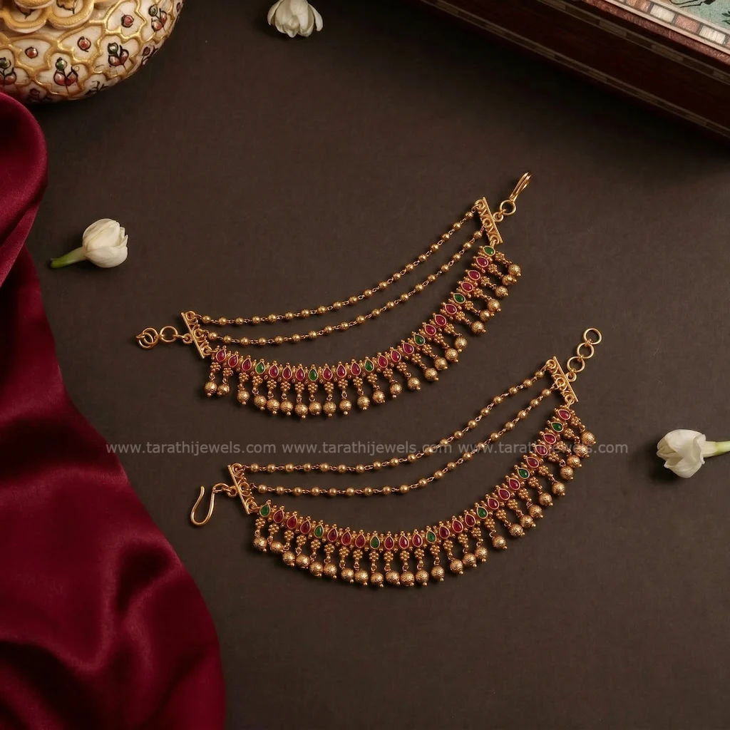 This Earring Mattal made of copper and brass with Ad stones and has a gold look alike finish to it.