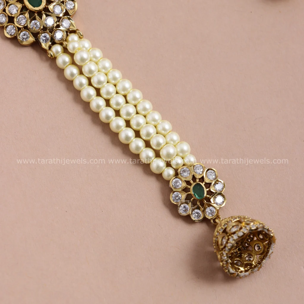 This bridal Jada billa is made of copper and brass with kemp stones and has a gold look alike finish to it.