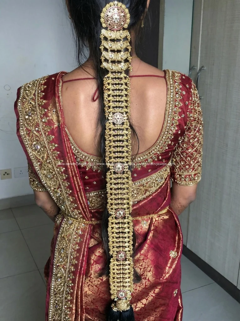 This bridal Jada billa is made of copper and brass with kemp stones and has a gold look alike finish to it.