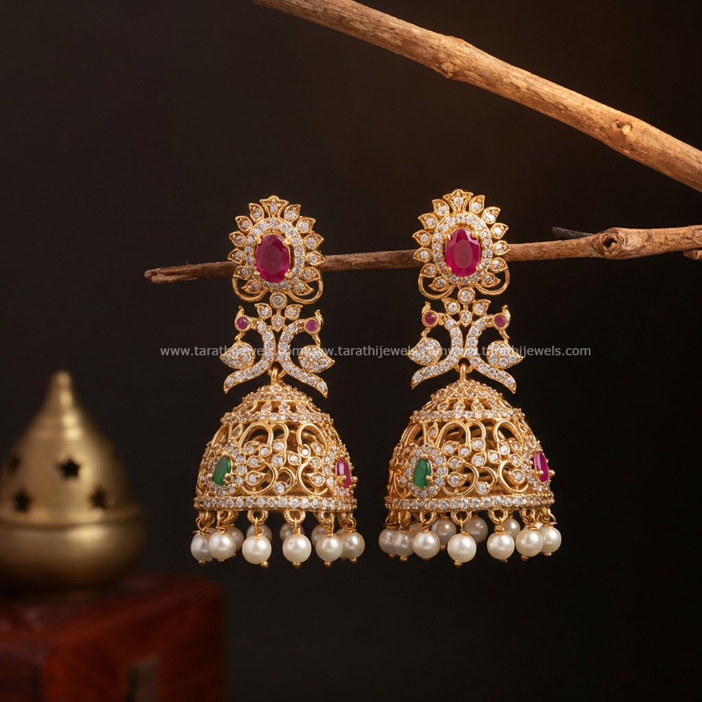 This beautiful Jumka made of copper and brass with American Diamond Stones and has a gold look alike finish to it.