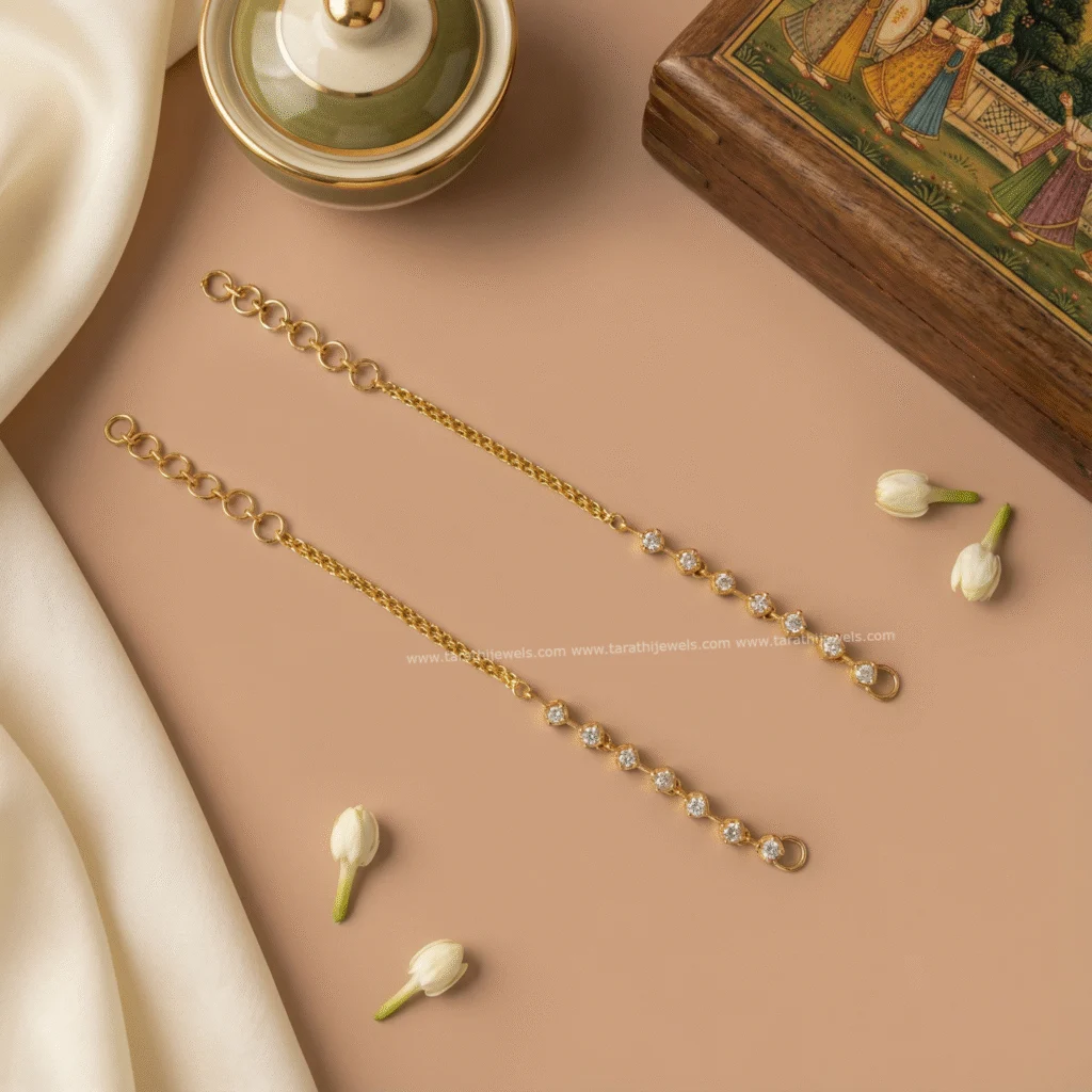 This Earring Mattal made of copper and brass with Ad stones and has a gold look alike finish to it.