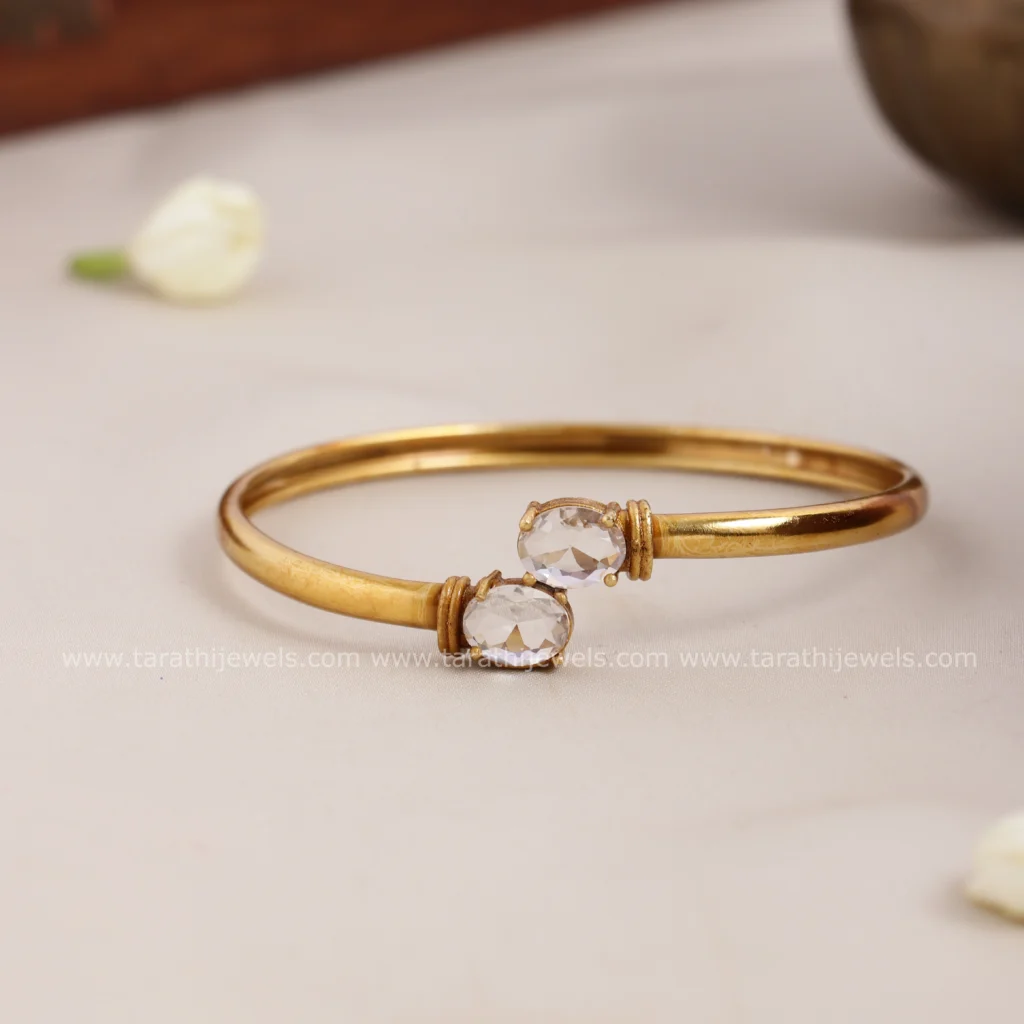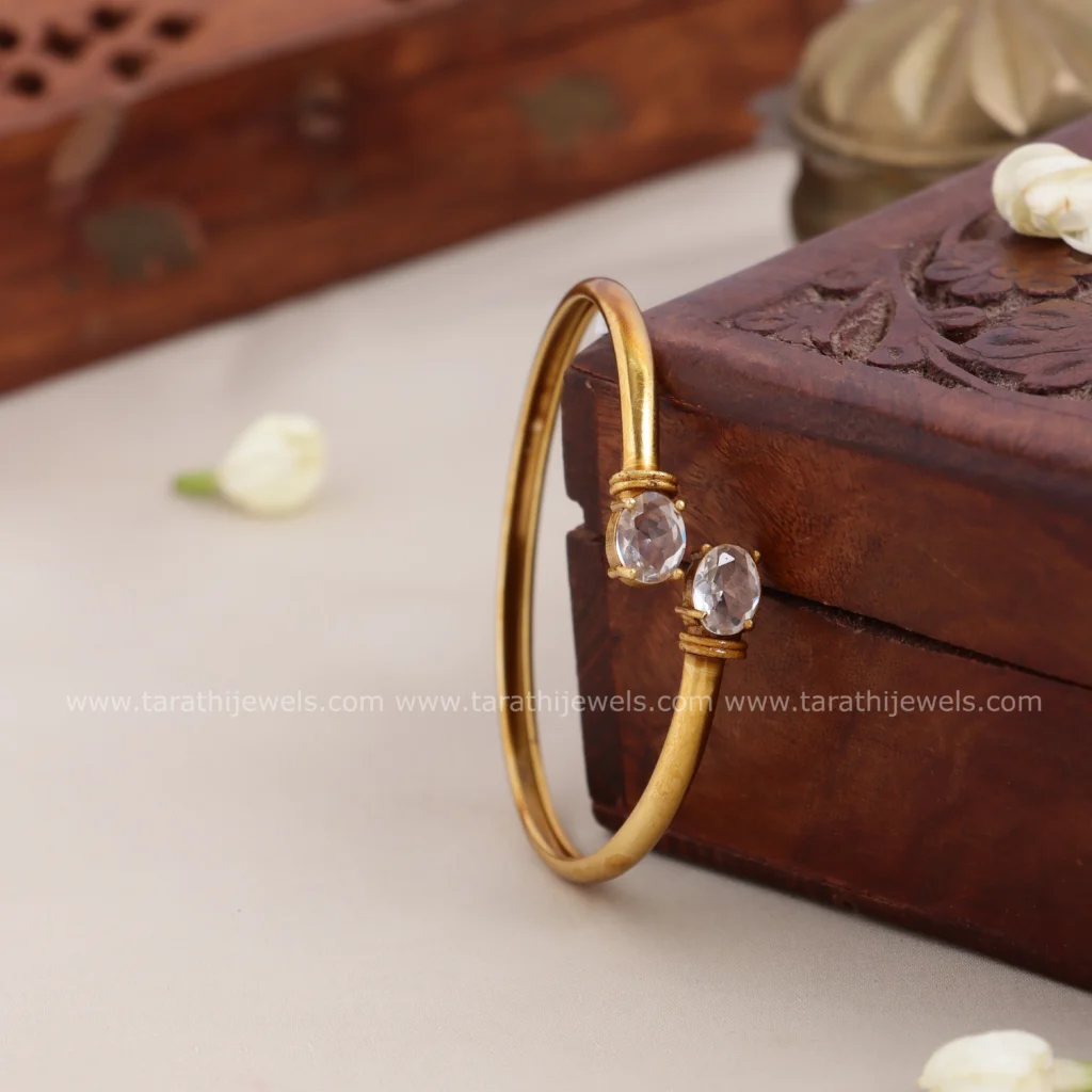 This beautiful bangle is made of copper and brass and Ad stones and has a gold look alike finish to it.