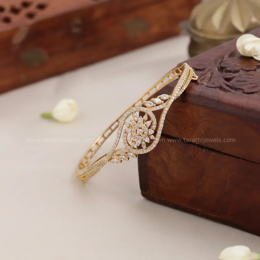 This beautiful bangle is made of copper and brass and Ad stones and has a gold look alike finish to it.