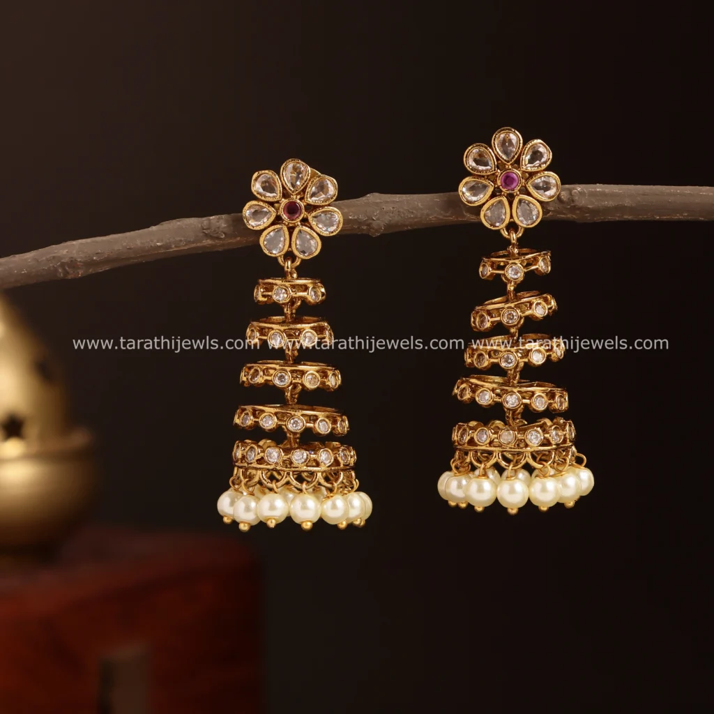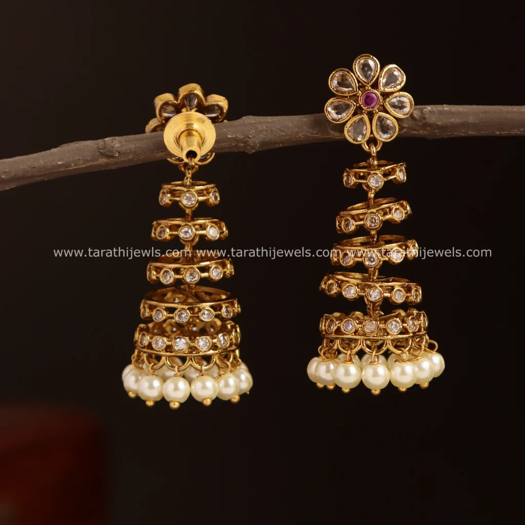 This beautiful Jumka made of copper and brass with kemp stones and has a gold look alike finish to it.