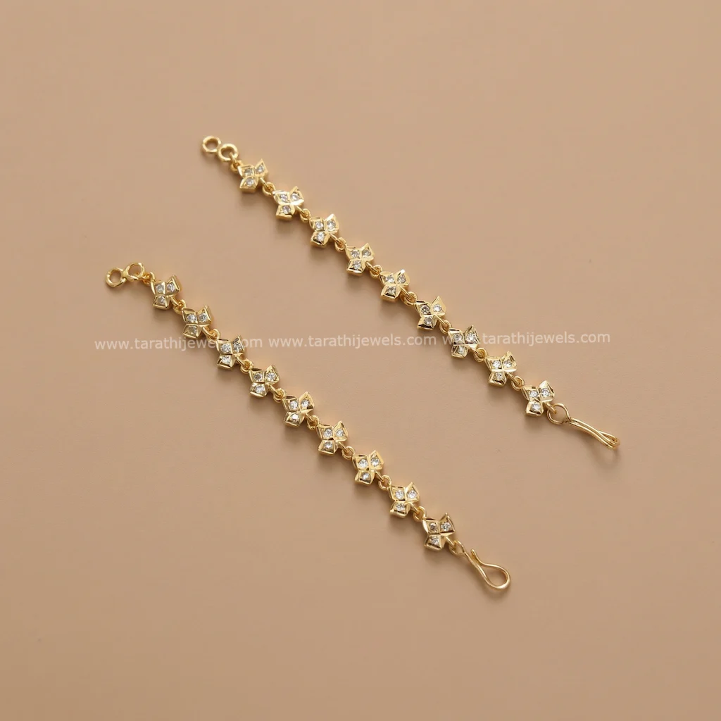 This Earring Mattal made of copper and brass with Ad stones and has a gold look alike finish to it.
