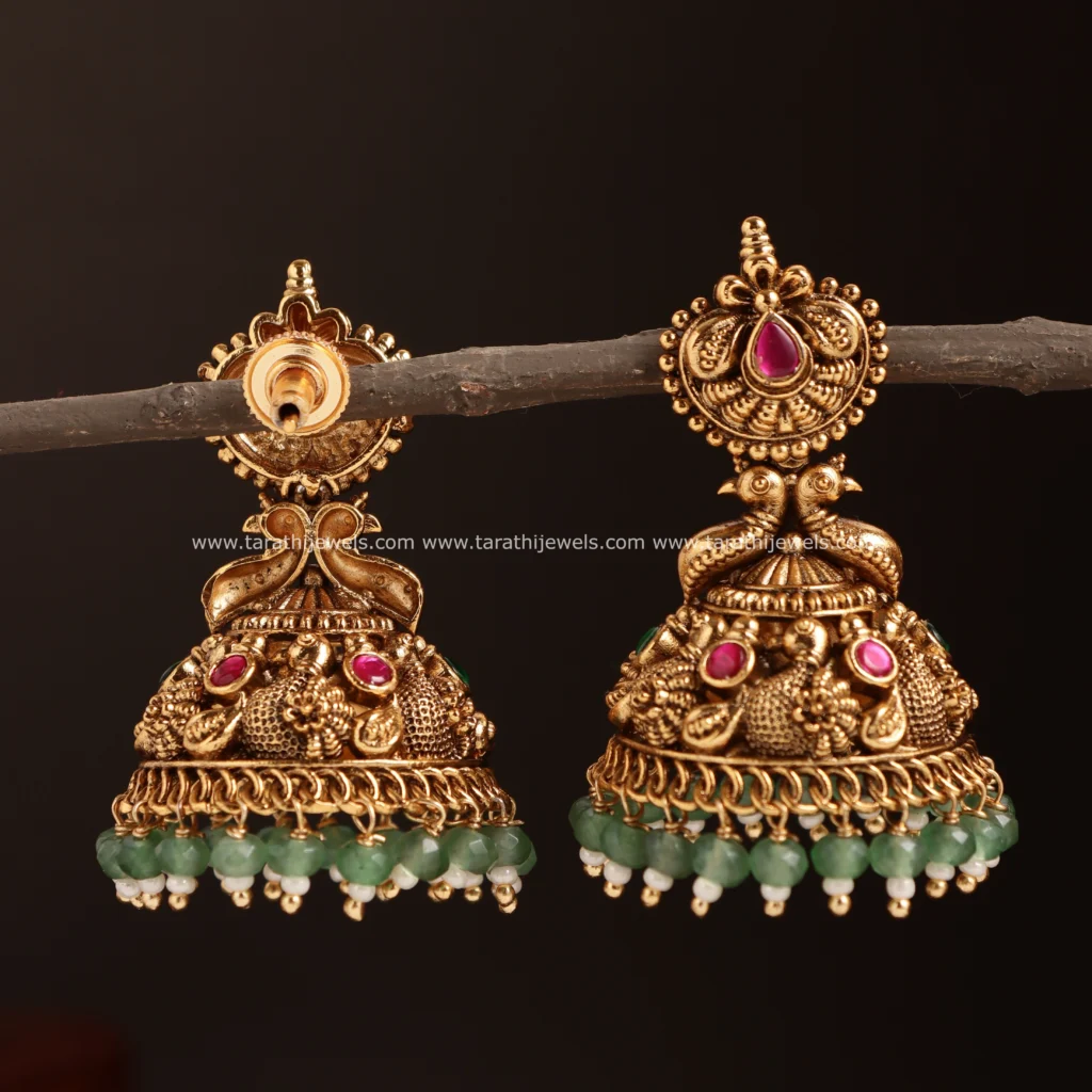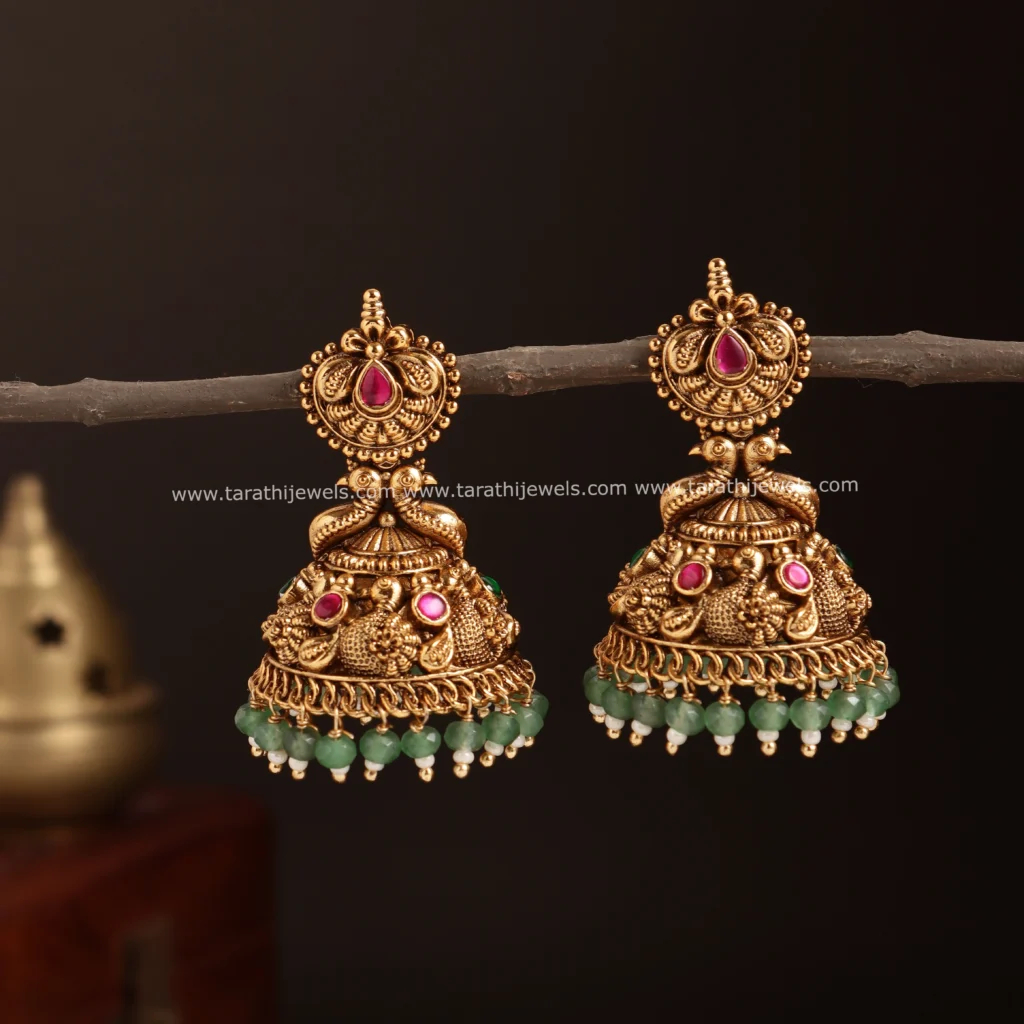 This beautiful Jumka made of copper and brass with kemp stones and has a gold look alike finish to it.