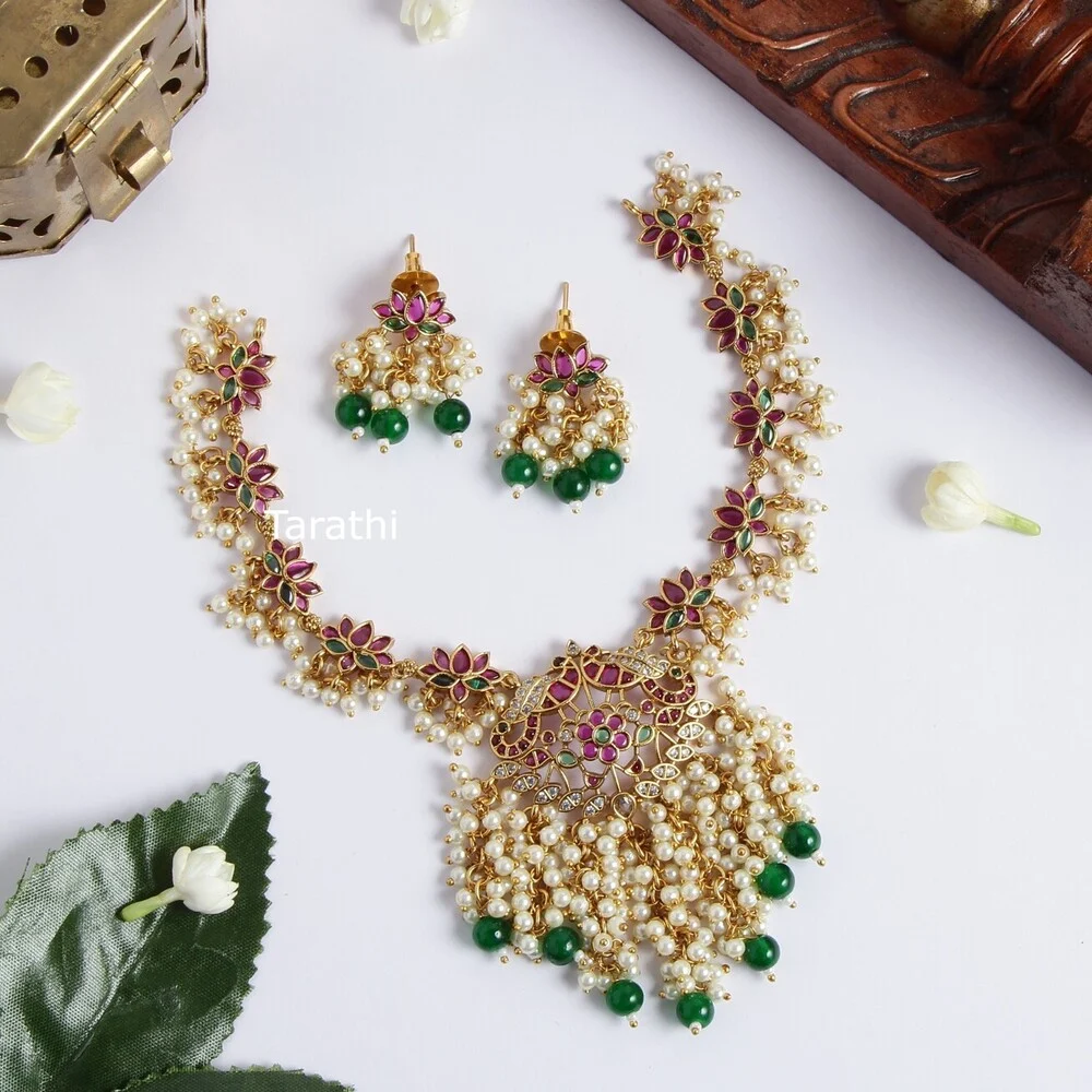 Make material: This beautiful necklace is made of copper and brass and American Diamond Stones and has a gold look alike finish to it.