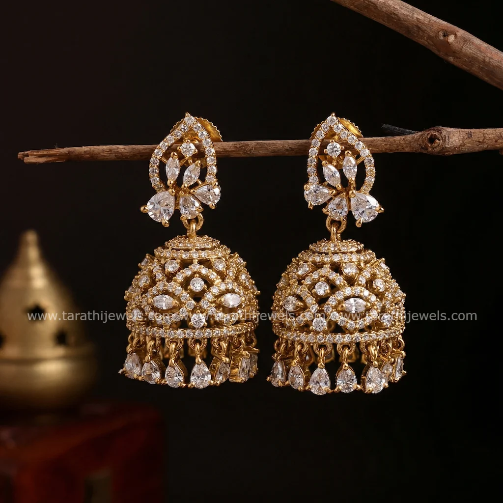 This beautiful Jumka made of copper and brass with Ad stones and has a gold look alike finish to it.