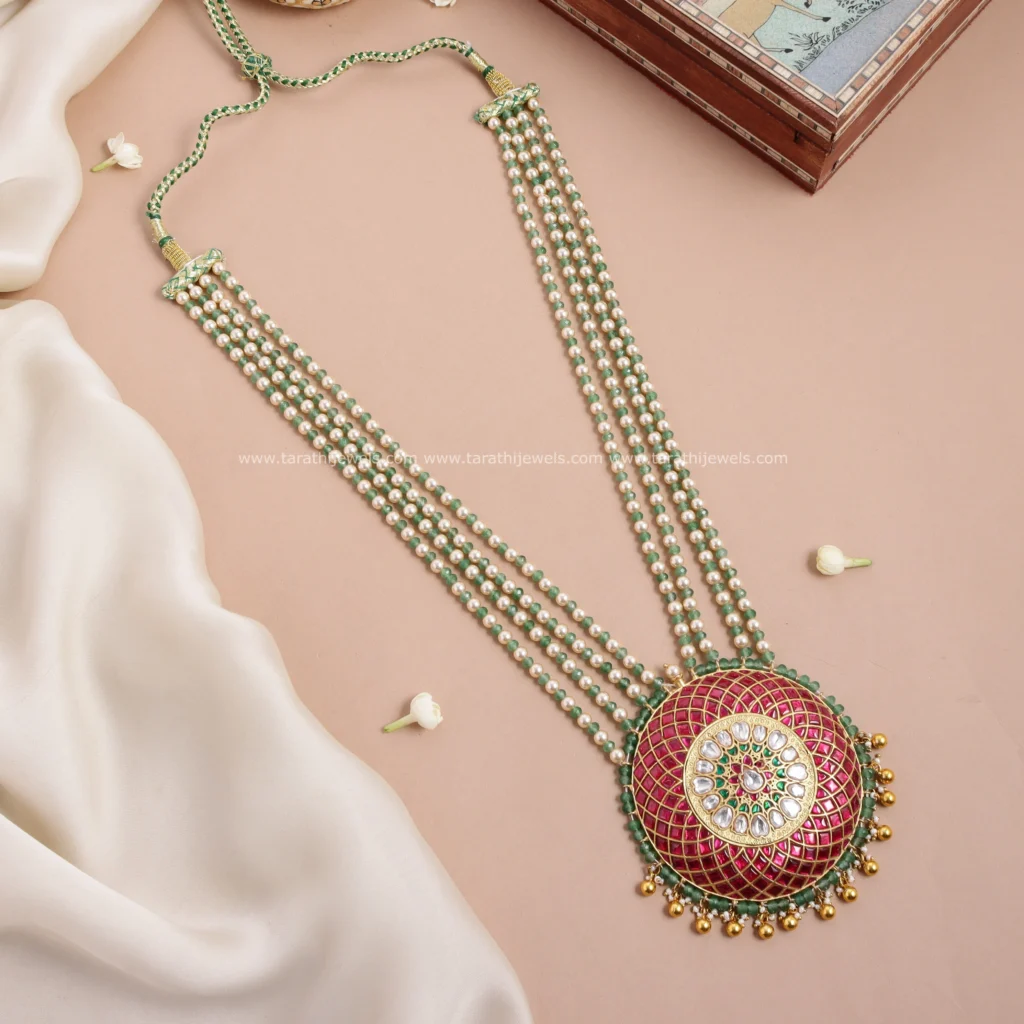 Make material: This Jadau Haaram is made of kundan stones and pearls and copper and brass alloy.