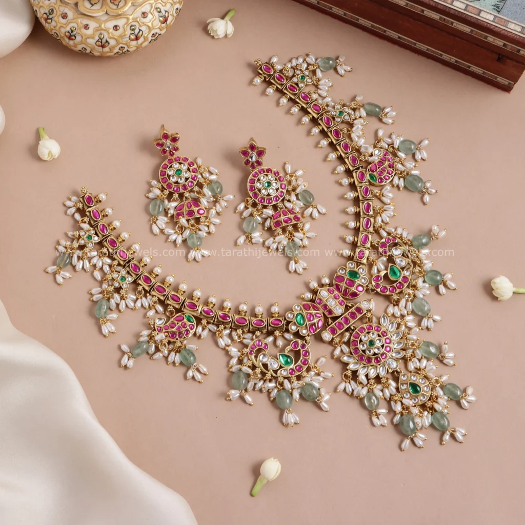 Make material: This Jadau Necklace is made of kundan stones and pearls and copper and brass alloy.