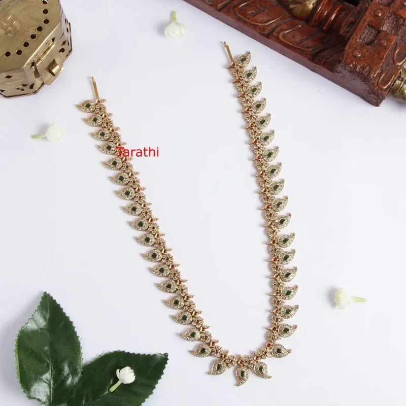 Make material –This Haaram is made of copper and brass and Imitation American diamond stones and has a gold look alike finish to it.